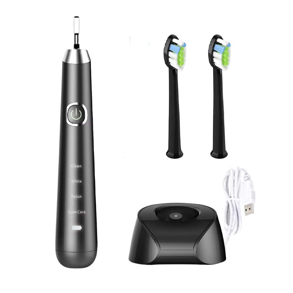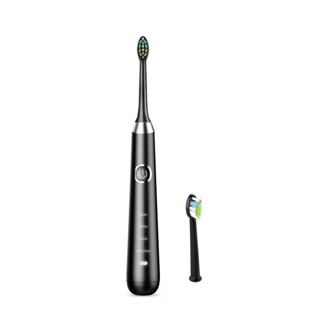 A sleek, slim electric toothbrush featuring 38,000 vibrations per minute, 4 cleaning modes (Clean, White, Polish, Gum Care), DuPont bristles, IPX7 waterproof rating, wireless inductive charging, and a stylish arc-shaped design with 4-layer UV coating. Comes with travel case, 2 brush heads, and wireless charging base. Available in White and Black.