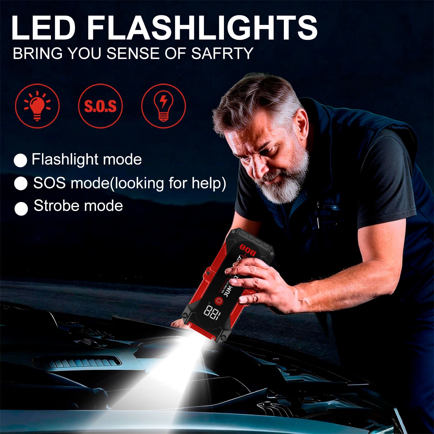 An 18800mAh portable emergency car jump starter with 1000A peak current, capable of jump-starting 3.5L gasoline and 2.0L diesel engines. Features dual USB outputs for device charging, Type-C input, spark-proof technology, and emergency LED lighting with multiple modes. Compact at 196x95x40mm, it works in extreme temperatures from -20°C to +60°C with 1000 cycle life.